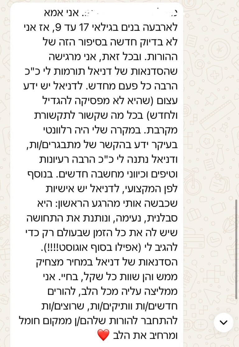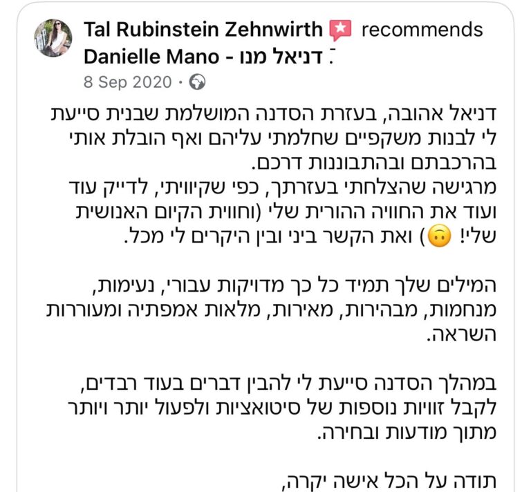 היי! אני דניאל מנו, מנחת הורים בגישה היקשרותית ותקשורת מקרבת מאז 2017. כאמא לשני מתבגרים שחיה חיים רצופי שינויים ומעברים באיטליה וארה״ב, חיפשתי ומצאתי גישה שהפכה למגדלור עבורי כאמא כבר 13 שנה. בזכותה אנחנו בטוחים ומשגשגים בתוך סערות החיים.